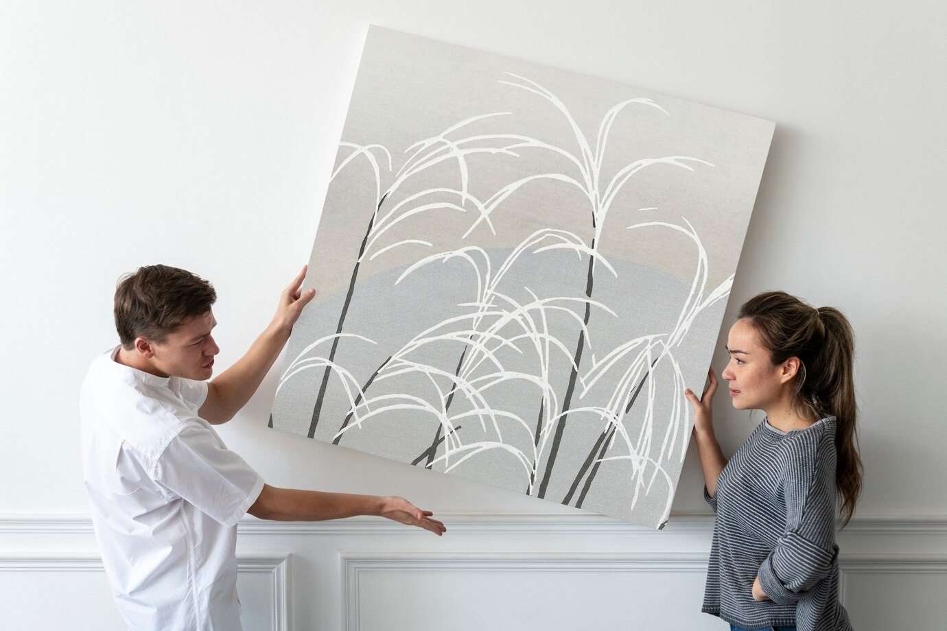 Tačiau svarbu proporcijos. Jei siena 3 metrų pločio, rekomenduojama, kad paveikslas užimtų apie 60-70 % centrinės zonos. Per mažas formatas „pasimes“. Per didelis – užgoš erdvę.